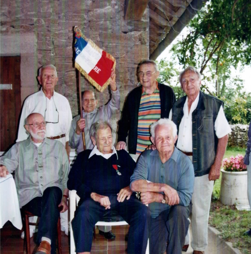 - 2d rang: Guy Offner, qui nous a laissé un beau film sur le 50è anniversaire de la libération de Rodez (dans la médiathèque); Piou qui brandit le fanion du maquis, Georges Claustre et Lucien Montarnal, indéfectibles piliers de l’Association des Anciens du Maquis Jean-Pierre.